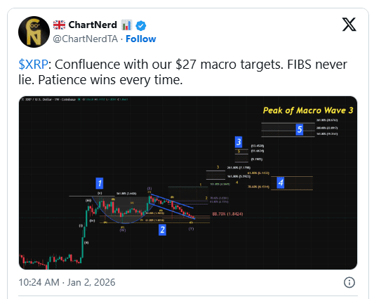 Znany analityk kryptowalut ChartNerd (@ChartNerdTA) opublikował analizę techniczną na długą metę dotyczącą XRP, wskazując na potencjalny olbrzymi wzrost w kierunku 27 USD. Analiza opiera się na silnym zgodzie między rozszerzeniami Fibonacciego a rozwijającym się strukturą fali Elliott na tygodniowym wykresie XRP/USD.