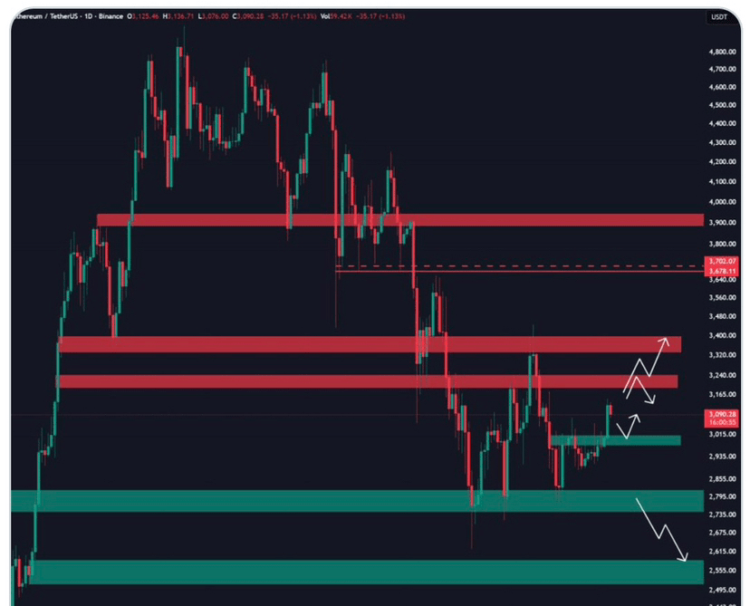 Uwaga rynku wzrosła po tym, jak ETH na chwilę przekroczył 3100 USD, a następnie cofnął się. Według analityka Ted Pillows, możliwe jest ponowne testowanie strefy 3020–3050 USD. Dodał, że utrzymanie ceny ETH w tym obszarze może przygotować kolejny poziom oporu na poziomie 3500 USD. Według danych dyskusje dotyczące Ethereuma skupiają się również na wzroście stakingu, rozwoju zarządzania oraz oczekiwaniach, że 2026 rok może oznaczać nowy cykl rekordów historycznych.