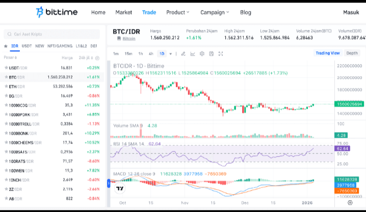 Wykres: cena BTC/USD na wykresie dziennym (z RSI i MACD) pokazuje, że Bitcoin konsoliduje się wokół 90K. RSI to ~62, a histogram MACD zmienia się na pozytywny (źródło: Bittime).