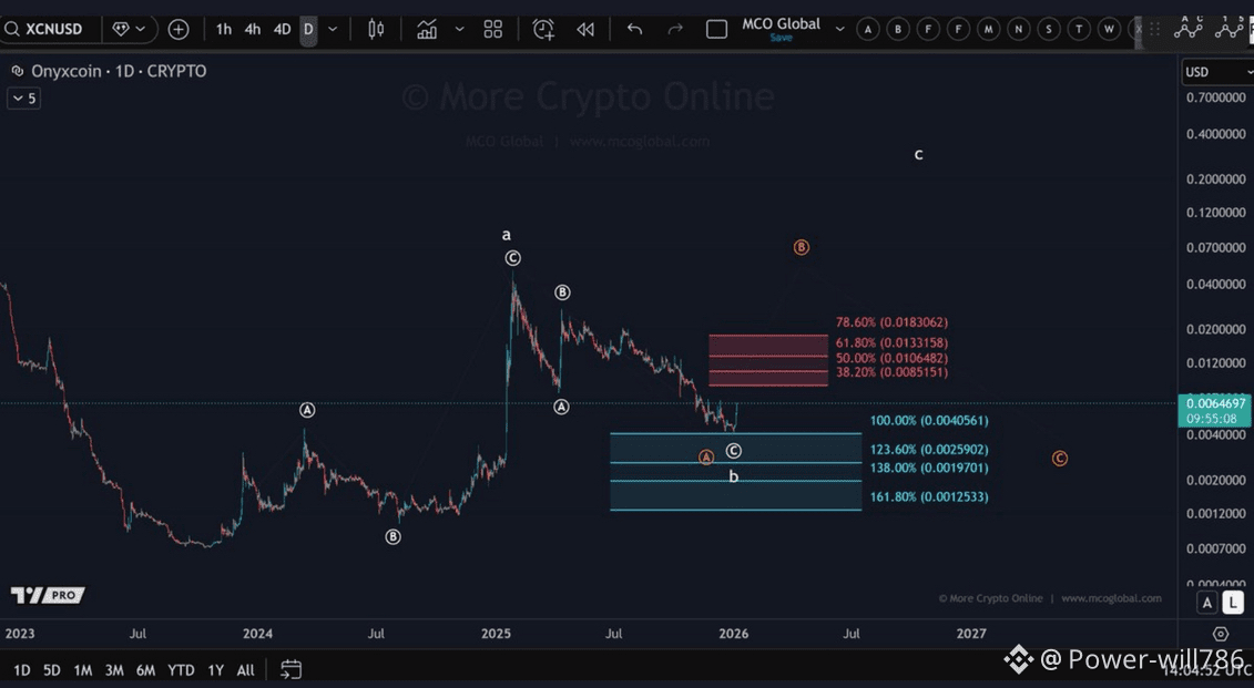 Price tapped the 100% extension during the pullback.This means, higher-timeframe structure still shows only 3-wave move to the upside, which makes a strong bullish outlook for now. The first key resistance sits between $0.00861 and $0.0183. Also worth noting: the orange wave B could still push to new highs before the correction fully plays out.