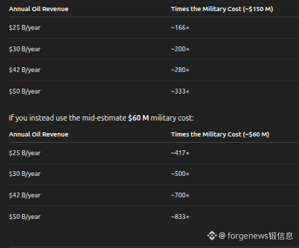 So for comparison, even the upper bound of the direct military cost is small relative to projected oil revenue. If you use $150 million as the “high cost”: