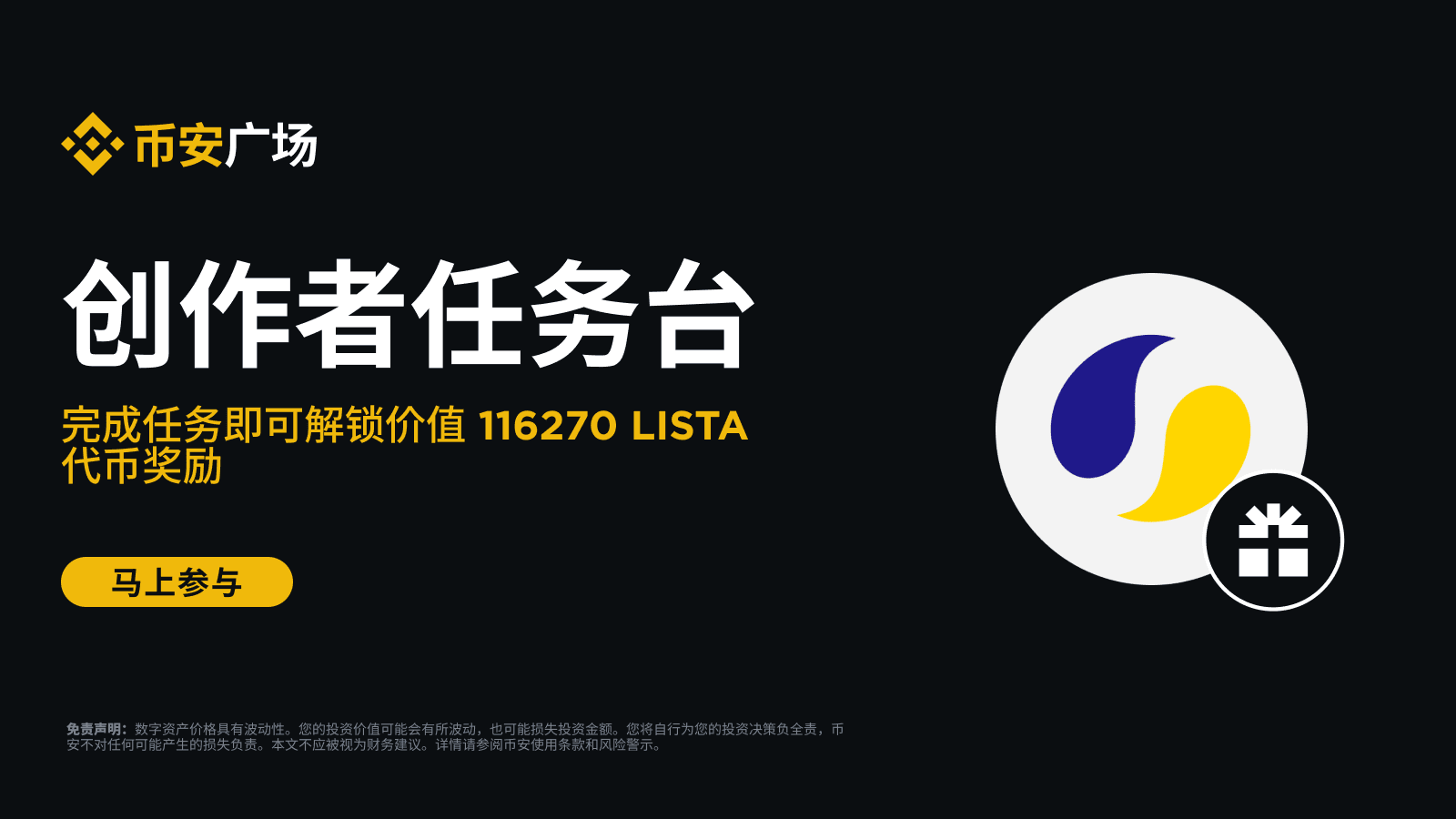 Plac Binance zostanie uruchomionyNowa akcja na tablicy zadań twórcówUżytkownicy, którzy przeszli autoryzację tożsamości, po wykonaniu określonych zadań mogą odblokować nagrodę w wysokości 116270 tokenów LISTA.