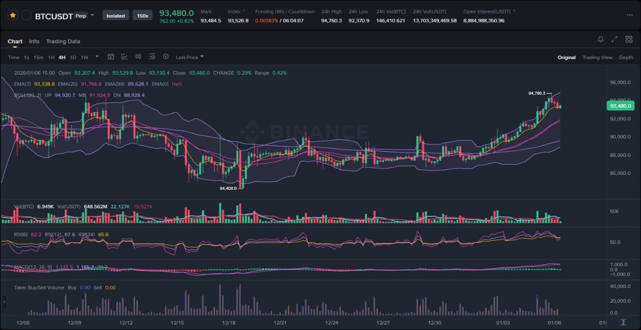 Wykres pokazuje wyraźną strukturę wzrostu dla Bitcoina, charakteryzującą się wyższymi szczytami i wyższymi dołkami od połowy grudnia, kiedy to cena spadła do około 85 000 dolarów. Ruch cenowy wydostał się z wielotygodniowego zakresu między 88 000 a 93 000 dolarów, z wyraźnym pięciofalowym impulsem widocznym w wzorach świecowych w ciągu ostatnich 48 godzin. Obserwowalne elementy obejmują ostry odrzut przy lokalnym szczycie 93 700 dolarów na początku sesji, po którym nastąpiło rozszerzenie zmienności, gdy pasma się poszerzyły, co sygnalizowało zwiększoną aktywność kupujących. Konsolidacja miała miejsce krótko w wąskim wzorze flagi tuż poniżej 94 000 dolarów, co zakończyło się wzrostem z zdecydowanym zamknięciem powyżej górnej granicy zakresu.