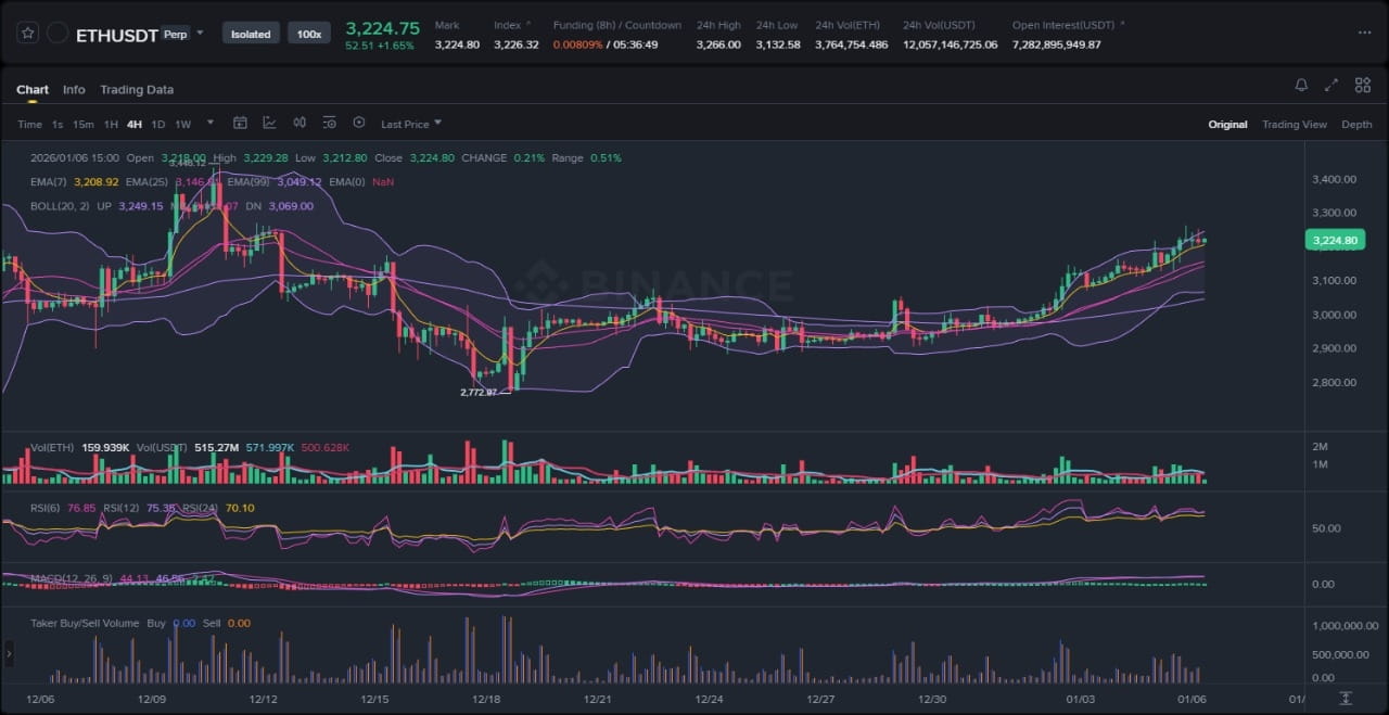 Rynek Ethereum obecnie przebywa w fazie konsolidacji po korekcie z ostatnich maksimów, z zachowaniem cenowym w wielotygodniowym zakresie pomiędzy około 3100 a 3400. Na załączonym wykresie 4-godzinnym ETH/USD notuje się w okolicach 3274, pokazując oznaki powrotu do średniej po testowaniu niższych punktów płynności w okolicach 3200. Wykładnicze średnie ruchome (EMAs) dają jasny obraz struktury: 7-okresowa EMA znajduje się powyżej 25-okresowej EMA, co wskazuje na krótkoterminowy nacisk bullishowy, podczas gdy obie pozostają tylko powyżej 99-okresowej EMA, sugerując, że trend wzrostowy od końca 2025 nadal istnieje, ale przebywa w fazie dystrybucji oczekującej potwierdzenia. Pasmów Bollinger skurczyły się, co wskazuje na zmniejszoną woli i potencjalny „squeez”, z ceną przylegającą do środkowego pasa po krótkim spadku poniżej niego, co uniknęło pełnego przebicia. Obserwowane elementy to lokalne dołki w 3205 tworzące wzór podwójnego dna, odrzucenie od górnej krawędzi pasm Bollinger w okolicach 3350 oraz impulsywny ruch w górę w poprzednim sesji, który odzyskał 25 EMA. Ogólnie rzecz biorąc, wskazuje to na strukturę ograniczoną do zakresu z potencjałem wzrostowym, ponieważ wykres nie wykazuje jasnych cech trendu spadkowego, takich jak kolejne niższe dołki.