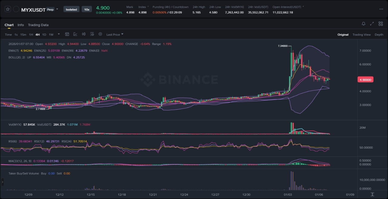 Szerszy rynek kryptowalut pozostaje w fazie konsolidacji po hossie z końca 2025 roku. Bitcoin stabilizuje się powyżej kluczowych poziomów wsparcia, a altcoiny, takie jak te z sektora DeFi, wykazują selektywną siłę. MYX, jako niszowy gracz na rynku zdecentralizowanych kontraktów futures, działa w tym środowisku, w którym płynność jest nierównomiernie rozłożona, a nastroje mogą się szybko zmieniać w zależności od rozwoju sytuacji w poszczególnych protokołach. Całkowita kapitalizacja rynkowa oscyluje wokół 2,5 biliona dolarów, a całkowita zablokowana wartość DeFi wykazuje umiarkowany wzrost, jednak aktywność on-chain platform instrumentów pochodnych, takich jak MYX, pozostaje w tyle za poziomami szczytowymi z połowy 2025 roku. To tło stanowi podstawę ostatnich ruchów MYX, w których zewnętrzne narracje zderzają się z wewnętrznymi wskaźnikami, stwarzając możliwości powrotu do średniej lub dalszej dystrybucji.