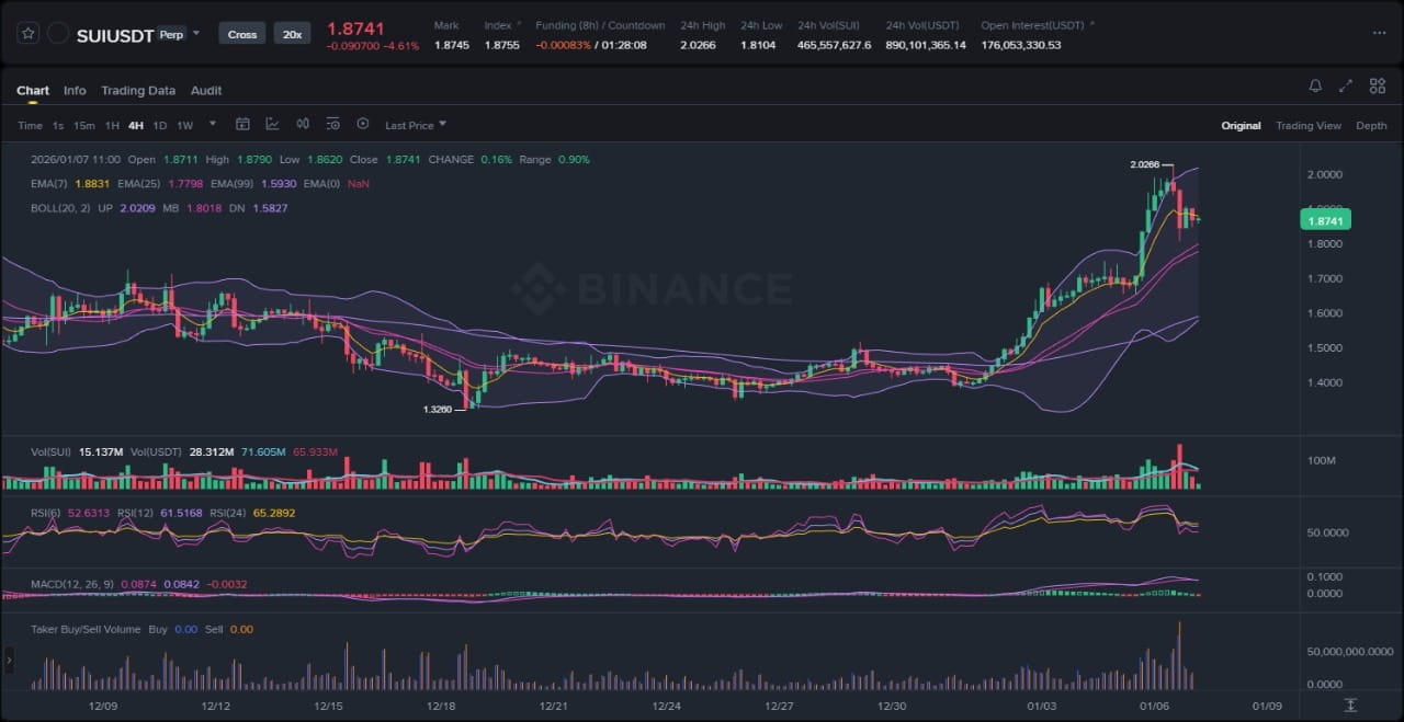 Para SUI/USDT na Binance pokazuje wyraźną strukturę trendu wzrostowego w ciągu ostatniego tygodnia, charakteryzującą się serią wyższych szczytów i wyższych dołków po fazie konsolidacji na początku miesiąca. Aktualnie handlowana wokół $2.00, cena wybiła się z kilku-dniowego zakresu między $1.70 a $1.90, próbując utrzymać się powyżej tego poziomu wybicia. Obserwowalne elementy obejmują impulsywny ruch w górę z lokalnego dołka $1.70 z 4 stycznia, po czym nastąpiła krótka konsolidacja w pobliżu $1.95 przed ostatnim odrzuceniem na górze zakresu, które teraz zostało przetestowane jako wsparcie. Zmienność wzrosła, co widać po rozszerzających się wstęgach Bollingera, z ceną przyklejoną do górnej wstęgi, sygnalizując potencjalne nadmierne rozciągnięcie, ale także miejsce na powrót do średniej w kierunku środkowej wstęgi, jeśli momentum osłabnie.
