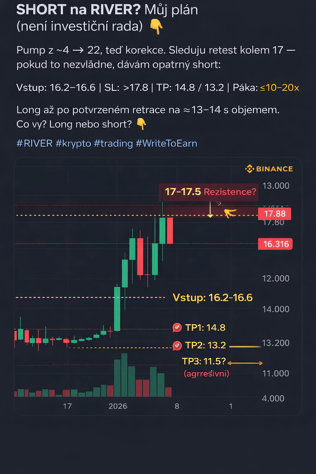 Pompka z ~4 → 22, teraz korekta. Obserwuję retest wokół 17 — jeśli tego nie zdoła, daję ostrożnego shorta.