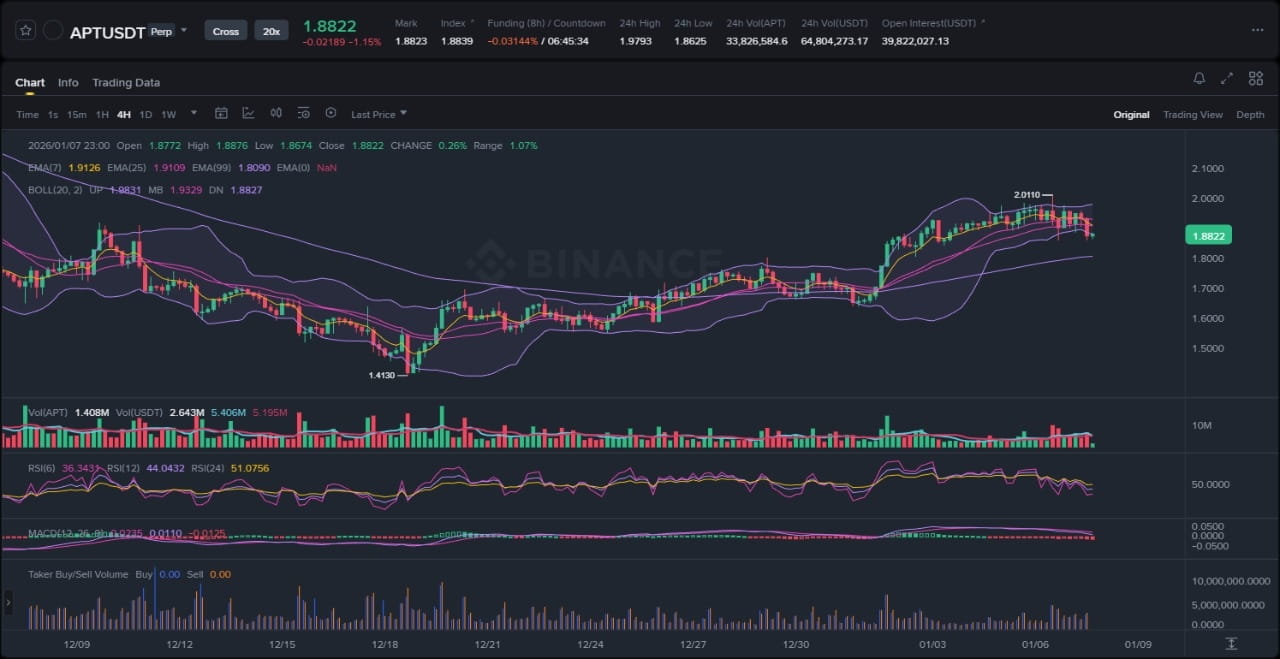 Rynek kryptowalut rozpoczął 2026 rok w spokojny sposób, z lekkimi korektami Bitcoina i Ethereum, które wywołały reakcje u innych kryptowalut, takich jak APT. Całkowita kapitalizacja rynku utrzymywała się wokół 2,5 biliona dolarów, spadając o około 2% w ciągu ostatniego tygodnia, co wynikało z realizacji zysków po roku końcowych wzrostach oraz utrzymujących się niepewności makroekonomicznych, takich jak oczekiwania dotyczące stóp procentowych Federal Reserve. W przypadku APT token handlowany jest w okolicach 1,91 dolarów w czasie 4-godzinnym, co umieszcza go w wielomiesięcznym zakresie, który ogranicza ruch cenowy między 1,70 a 2,10 dolarów od połowy grudnia 2025 roku. Ta struktura ograniczona sugeruje fazę dystrybucji, w której kupujący i sprzedający są w równowadze, czekając na katalizator, który wywoła przebicie lub przebicie w dół. Pasy płynności wydają się cienkie poniżej 1,80 dolarów, co może przygotować scenariusz przejęcia płynności, jeśli nacisk w dół wzrośnie, podczas gdy opór nad głową przy 1,93 dolarach nadal stanowi kluczowe pole walki. Objętość handlu zmniejsza się, co wskazuje na spokojne warunki handlowe, które często poprzedzają rozszerzenie woli, co zgadza się z neutralnym do bearishnym nastrojem w ostatnich wskaźnikach szerokości rynku.