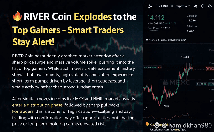 RIVER ایک ایسا کوائن ہے جو نسبتاً کم مارکیٹ کیپ اور زیادہ وولیٹیلٹی رکھتا ہے، اور زیادہ تر فیوچرز یا پرپیچوئل مارکیٹ میں ٹریڈ ہو رہا ہے۔ اس قسم کے کوائنز میں بنیادی عوامل کے بجائے لیکویڈیٹی، لیوریج اور شارٹ ٹرم سپیکولیشن زیادہ اثر انداز ہوتے ہیں۔ یہی وجہ ہے کہ ان میں قیمت اچانک اوپر جاتی ہے اور پھر اتنی ہی تیزی سے نیچے آ جاتی ہے، جس سے ریٹیل ٹریڈرز اکثر نقصان میں پھنس جاتے ہیں۔