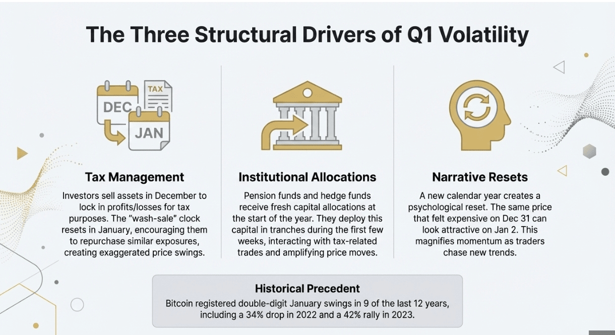 Po pierwsze, zarządzanie podatkami zachęca do sprzedaży w grudniu, a następnie do ponownego zakupu podobnych ekspozycji, gdy zegar wyprzedaży się resetuje. Dla aktywów z cienkimi książkami zamówień w porównaniu do akcji, nawet skromne przepływy tworzą wyolbrzymione wahania.