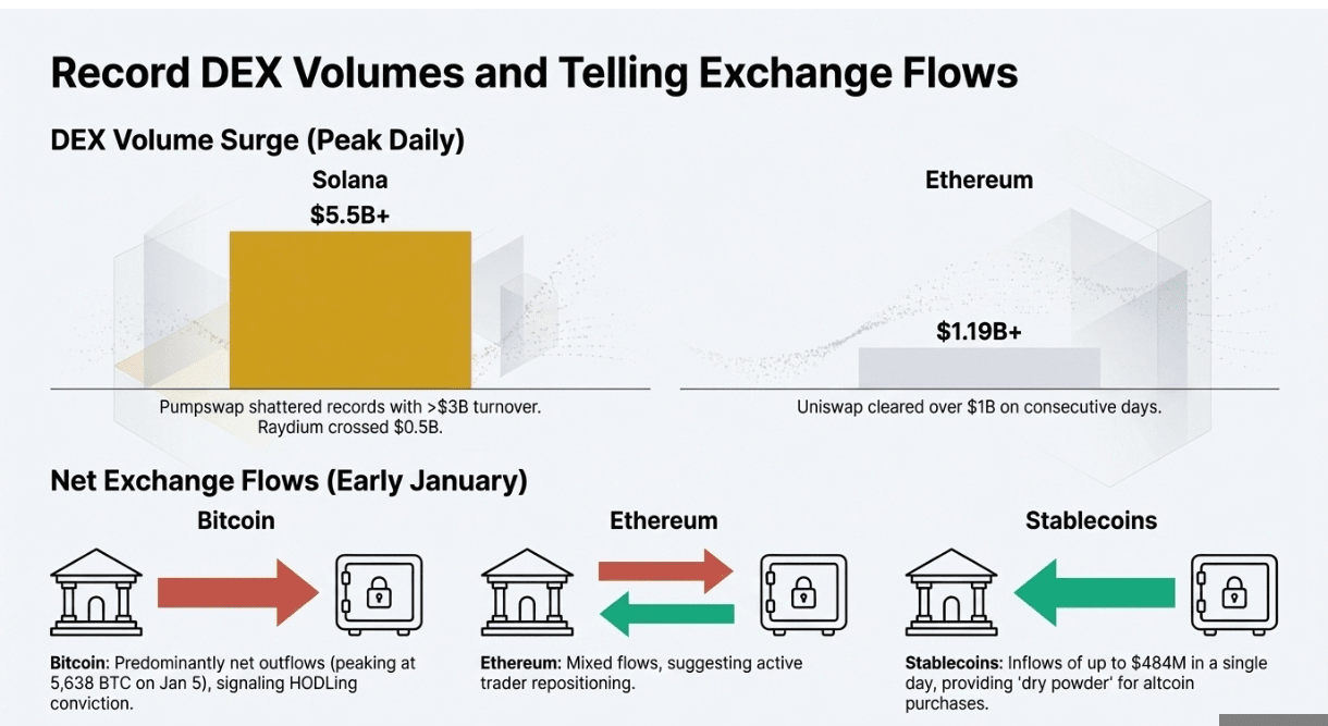 Wczesne dane Q1 ujawniają, że inwestorzy nie tylko tweetują o ryzyku; angażują środki. Na Ethereum, Uniswap zrealizował 1,08 miliarda USD 1 stycznia i 1,19 miliarda USD 2 stycznia, podczas gdy Curve i Fluid odnotowały swoje własne wzrosty. Pumpswap Solany pobił poprzednie rekordy, osiągając 2,76 miliarda USD obrotu w pierwszym dniu roku, a 2 dni później wzrósł do ponad 3 miliardów USD. Raydium przekroczył 0,5 miliarda USD. Szczytowe dzienne sumy na Solanie przekroczyły 5,5 miliarda USD, ilustrując, że samodzielnie stylizowana „sezon altcoinów Ethereum” 2021 roku ma teraz odpowiednik międzyłańcuchowy.