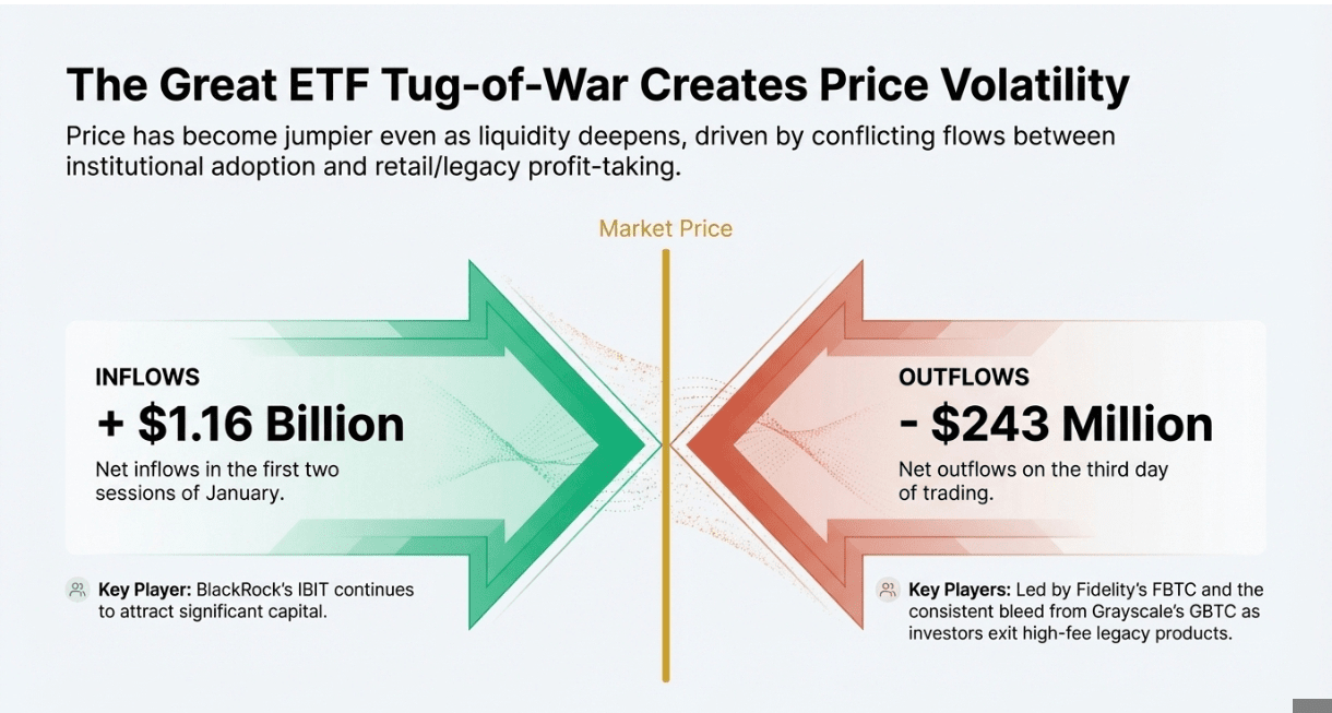 Za świecami znajdują się fundusze notowane na giełdzie, które obecnie dominują przepływy. Grudzień odnotował skromne 57 milionów USD netto w napływach w produktach spot, ale pierwsze 2 sesje stycznia przyciągnęły 1,6 miliarda USD. Dzień 3 przekształcił się w 243 miliony USD netto odpływów, prowadząc przez FBTC Fidelity i nieprzerwaną utratę z GBTC, podczas gdy IBIT BlackRock nadal przyciągał kapitał. Zawodowy rozgrywający pomiędzy inwestorami wychodzącymi z produktów o wysokich opłatach a instytucjami wchodzącymi do niskokosztowych pojazdów wyjaśnia, dlaczego cena stała się bardziej skoczna, nawet gdy płynność się pogłębia. Dodaj do tego decyzję MicroStrategy o zakupie kolejnych 1,287 BTC, podnosząc jej skarb do 673,783 BTC, a komunikat jest niepodważalny: duże bilanse nadal traktują bitcoina jako zabezpieczenie rezerwowe, ale już nie poruszają się w jedności.