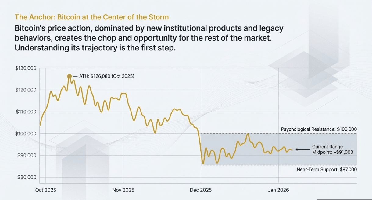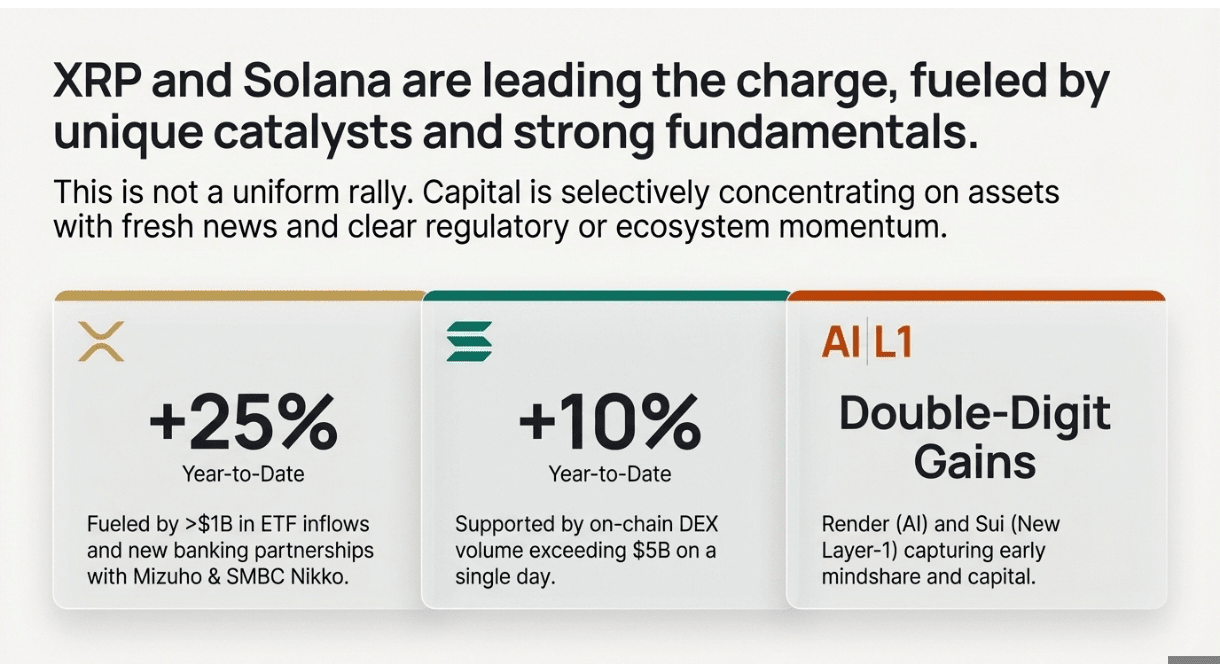 Solana dodała blisko 10% między Nowym Rokiem a 8 stycznia, wspierana przez wolumeny giełdy zdecentralizowanej powyżej 5 miliardów USD tylko 3 stycznia, podczas gdy Ethereum zdołało prawie 7% mimo oddania zysków podczas tej samej korekty, która uderzyła w bitcoina. Mniejsze nazwy związane z tematami sztucznej inteligencji, takie jak Render, lub nowi uczestnicy Layer-1, tacy jak Sui, odnotowały dwucyfrowe wybuchy, które przyciągnęły uwagę mediów społecznościowych. Wzór ten wzmacnia sprawdzoną rzeczywistość stycznia: przywództwo nagłówkowe zaczyna się od dużych spółek, a następnie ciekawość szybko przepływa do podsektorów z nowymi narracjami.