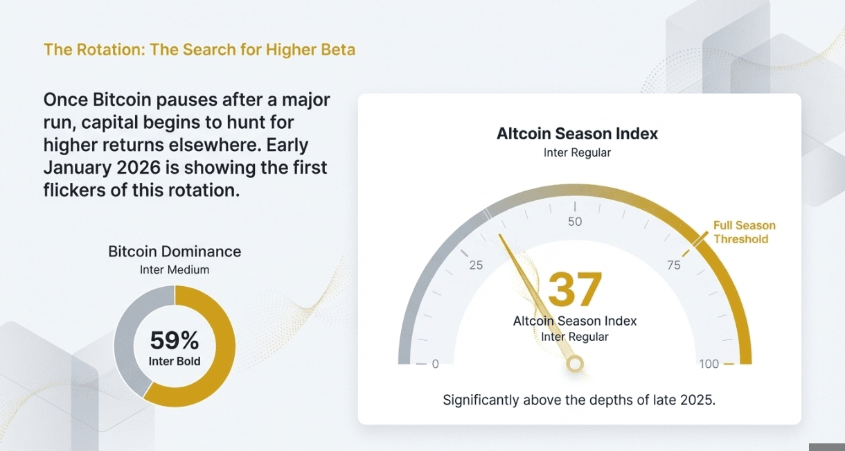 Podczas gdy dominacja bitcoina oscylowała w pobliżu 59% na początku stycznia, obserwatorzy dostrzegli pierwszy błysk rotacji altcoinów. Indeks Sezonu Altcoinów wzrósł do 37, wciąż poniżej progu 75, który historycznie definiuje pełny sezon, ale znacznie powyżej głębin późnego 2025 roku.