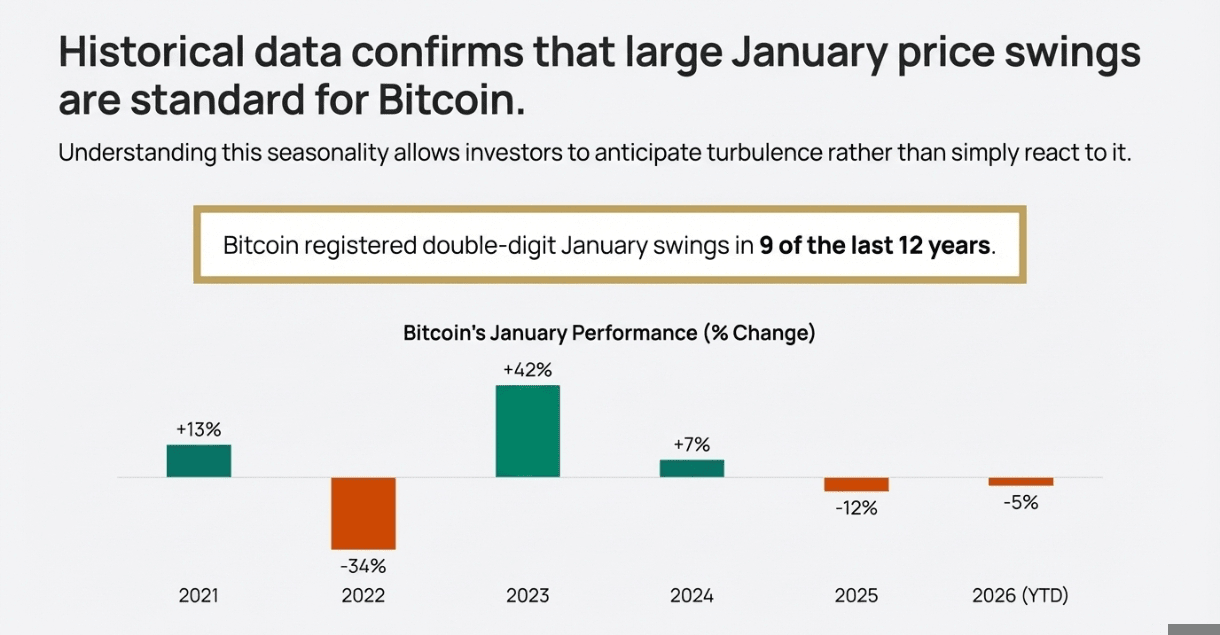 Dane historyczne uzasadniają oczekiwania. Bitcoin zarejestrował dwucyfrowe wahania w styczniu w 9 z ostatnich 12 lat, w tym spadek o 34% w styczniu 2022 roku i wzrost o 42% w styczniu 2023 roku. Wzór ten jest mniej związany z superstycjami kalendarzowymi, a bardziej z mikrostrukturą przepływów kapitałowych.