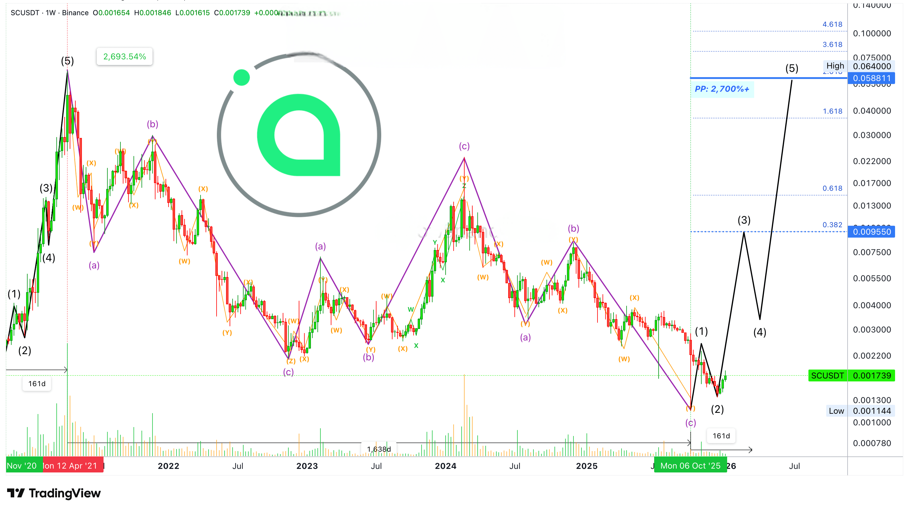 Ostatni rynek wzrostowy Siacoin miał miejsce na początku 2021 roku, prawie pięć lat temu. W późnym 2023 roku i na początku 2024 roku było pewne zachowanie na wzrost, ale trudno byłoby to nazwać rynkiem wzrostowym, ja wyraźnie widzę to jako długoterminową odwróconą korektę w terminologii fal Elliotta. Od listopada 2022 roku do marca 2024 roku.