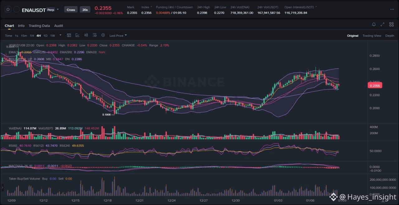 Practical takeaways for monitoring include: first, volume behavior at 0.2029— a spike above average could indicate genuine demand, while fading volume might confirm a liquidity grab by sellers. Second, reaction at the $0.24 key area upon any retest; sustained rejection would reinforce resistance, but a breakout with Bollinger Band expansion could shift the structure to bullish. Third, momentum shifts via MACD crossovers and RSI divergence—positive divergence from current levels would bolster the case for holding the support, whereas continued bearish alignment might prompt caution on long positions. These elements, when tracked in real-time, provide a framework for navigating ENA's volatility without committing to directional bets.