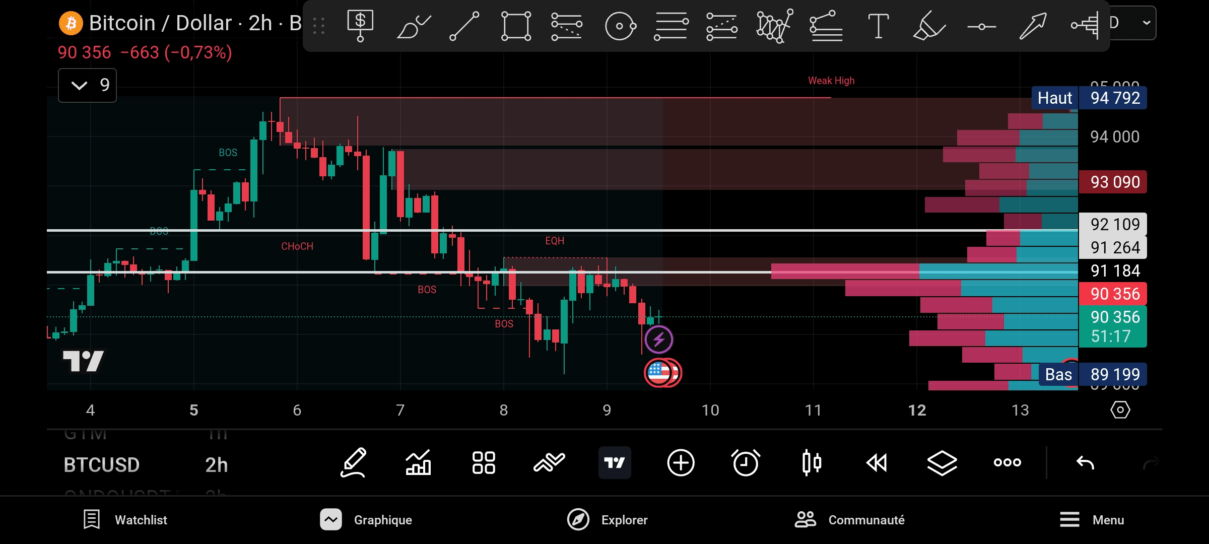 91,200 – 91,300 ➡️ Obszar równowagi / oporu obecnie.