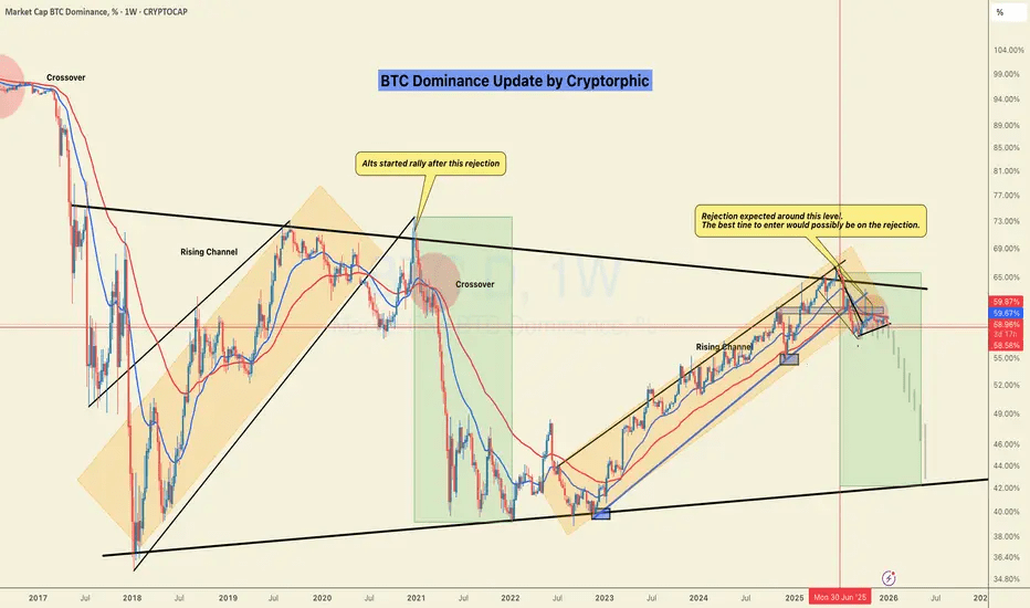 Odrzucenie wokół obecnych poziomów (około 59–60%) byłoby silnym sygnałem do przejęcia kapitału do altcoinów.