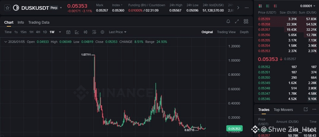 If you stare at the $DUSK weekly chart long enough, you notice something interesting. It’s not screaming for attention anymore. No wild spikes. No dramatic collapses. Just price moving sideways, slowly, almost awkwardly.