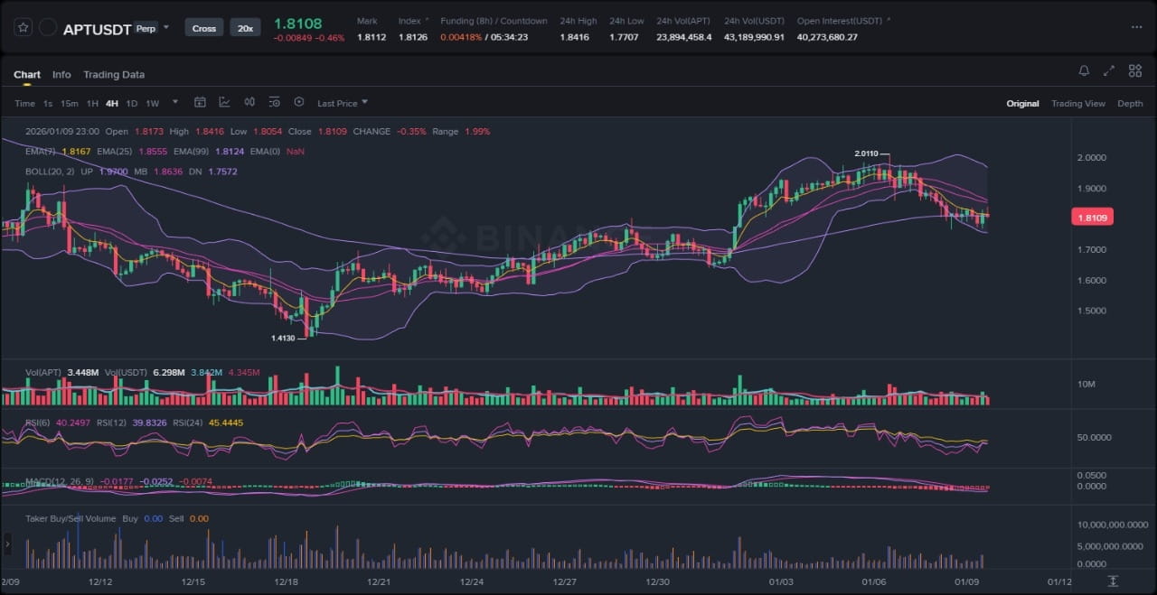 Ogólny rynek kryptowalut doświadczył znaczącego spadku, a APT odzwierciedla ten spadek w ostatnich sesjach. Handlowany w okolicach 1,91 $, APT odbija spokojne warunki charakteryzujące się niską płynnością i brakiem agresywnego zainteresowania zakupowego. Ten cofnięcie się zgadza się z ogólnymi ruchami rynku, gdzie Bitcoin i Ethereum również cofnęły się od ostatnich szczytów, ciągnąc za sobą altcoiny takie jak APT w fazę skorelowanej dystrybucji. Z perspektywy makroekonomicznej ogólna sentyment kryptowalut pozostaje ostrożny, wpływany przez czynniki makroekonomiczne takie jak oczekiwania dotyczące stóp procentowych i szepty o regulacjach, choć jeszcze nie pojawiły się żadne natychmiastowe katalizatory, które mogłyby odwrócić trend. Ruch cenowy APT w ciągu ostatniego tygodnia pokazuje wzorzec konsolidacji po impulsywnym spadkowym ruchu, z tokenem zawieszonym w pobliżu dolnej granicy krótkoterminowego zakresu. Obserwatorzy zauważają, że objętości transakcji wzrosły w określonych segmentach ekosystemu, jednak nie przekształciły się one w trwałe wzrosty cen, wskazując na rozłączenie między aktywnością na łańcuchu a ceną rynkową.