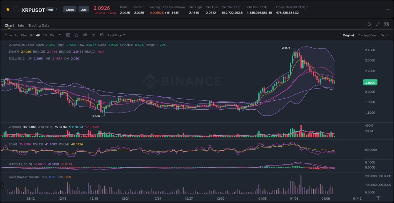 Szerszy rynek kryptowalut doświadczył burzliwego początku 2026 roku, z Bitcoinem i Ethereum nadającymi ton poprzez zwiększoną zmienność po zakończeniu dźwigni na koniec roku. XRP, handlujące w okolicach 2,03 USD według najnowszych danych, odzwierciedla to środowisko, ale kreuje swoją własną narrację w obliczu rosnącego ekosystemu Ripple. Całkowita kapitalizacja rynkowa waha się wokół 2,5 biliona USD, z altcoinami takimi jak XRP wykazującymi względną odporność w porównaniu do tokenów o mniejszych kapitalizacjach. Kieszenie płynności w zakresie 1,80–2,20 USD absorbują presję sprzedaży, co sugeruje, że faza dystrybucji ustępuje miejsca potencjalnej akumulacji. Instytucjonalne napływy do rozwiązań płatniczych opartych na blockchainie wciąż wspierają sentyment, chociaż makroekonomiczne wiatry przeciwnych, takie jak oczekiwania dotyczące stóp procentowych i napięcia geopolityczne, pozostają zewnętrznymi zmiennymi.