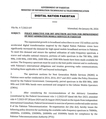 Rząd Pakistanu wydał dyrektywę polityczną dotyczącą nadchodzącej aukcji pasm częstotliwości radiowych skierowanej na poprawę usług mobilnych generacji następnej. Ta dyrektywa, która wynika z szerszej strategii transformacji cyfrowej kraju, określa proces aukcji dla kluczowych pasm częstotliwości, w tym 700 MHz, 1800 MHz, 2100 MHz, 2300 MHz, 2600 MHz i 3500 MHz.