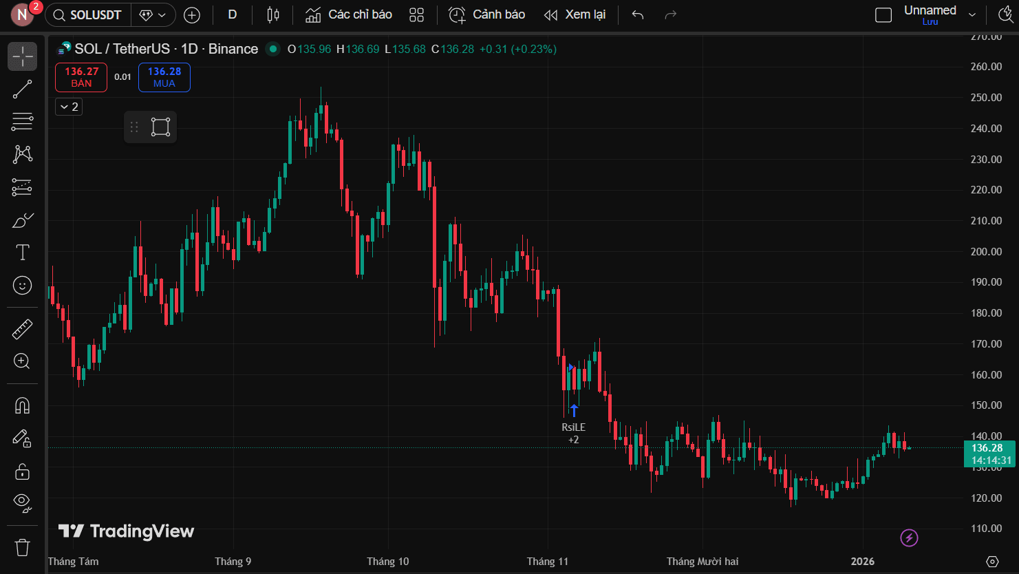 Patrząc na SOL w czasie D, trend spadkowy jest jasny i nie budzi sporów. Ale interesujące jest tempo ostatnich ruchów. Po silnym spadku cena przestała być ciągle naciskana i przechodziła do wąskiego drgań, płynność stopniowo spadała. To bardzo znane stan przed zmianą tempa rynku. Ostatnie odskoki nie były silne, nie wywoływały fomo, ale każda korekta nie przebiła poprzedniego dna.