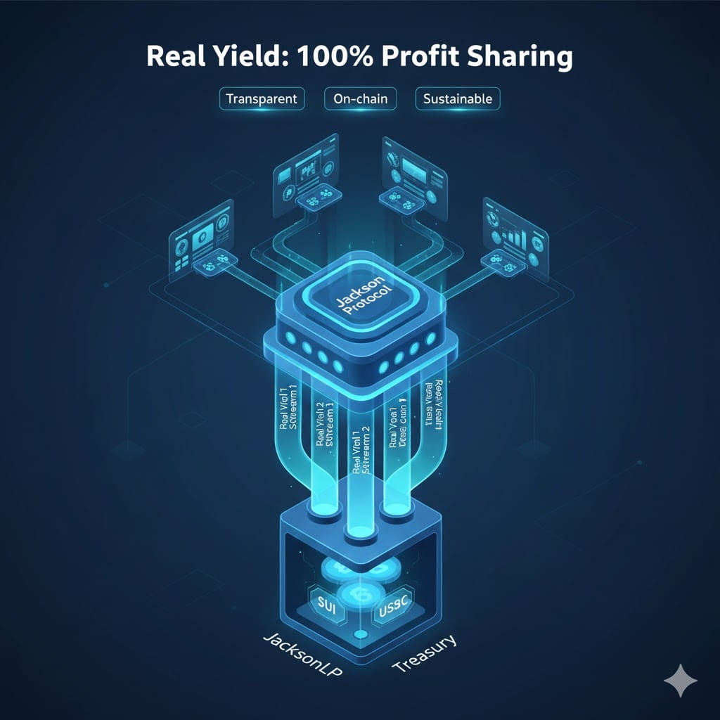Model JacksonLP jest jego podstawową tarczą przeciwko rynkowym wahaniom. 100% zysków generowanych przez protokół (takich jak prowizje od transakcji RWA, opłaty za usługi gier itp.) jest przydzielane do LP. Ten przejrzysty model zysku nie opiera się na inflacji, lecz na rzeczywistym przepływie biznesowym, co zapewnia ekosystemowi zdolność do samoregeneracji nawet w trudnych czasach rynkowych.