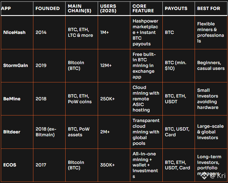 The top free crypto mining apps for 2025 are NiceHash, StormGain, BeMine, Bitdeer, and ECOS. These platforms are designed to make cryptocurrency mining simple and accessible, giving users a way to participate without investing in costly GPUs or ASICs.