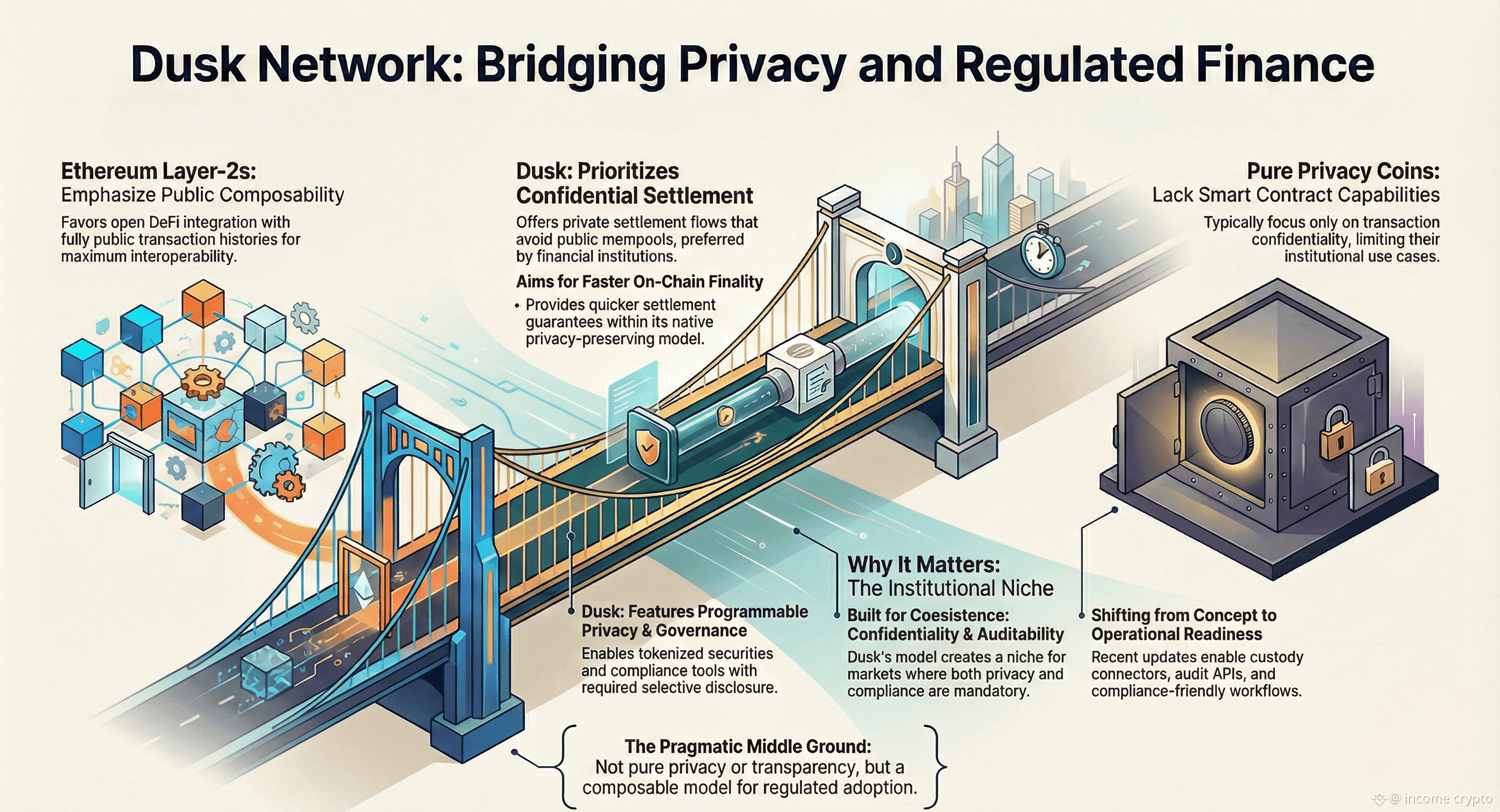 DUSK occupies a pragmatic middle ground - not pure privacy, not pure transparency, but a composable model aimed at regulated adoption.