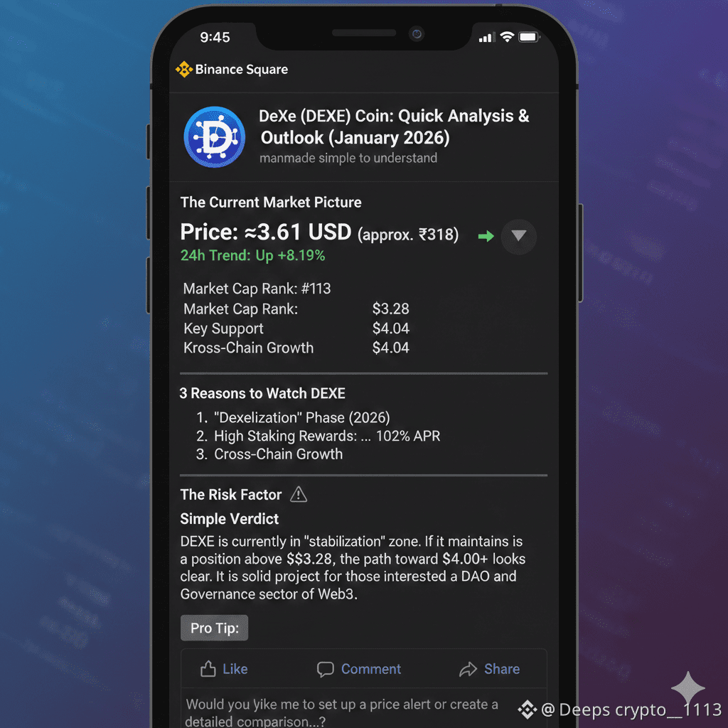 DEXE is currently in a "stabilization" zone. If it maintains its position above $3.28, the path toward $4.00+ looks clear. It is a solid project for those interested in the DAO and Governance sector of Web3.