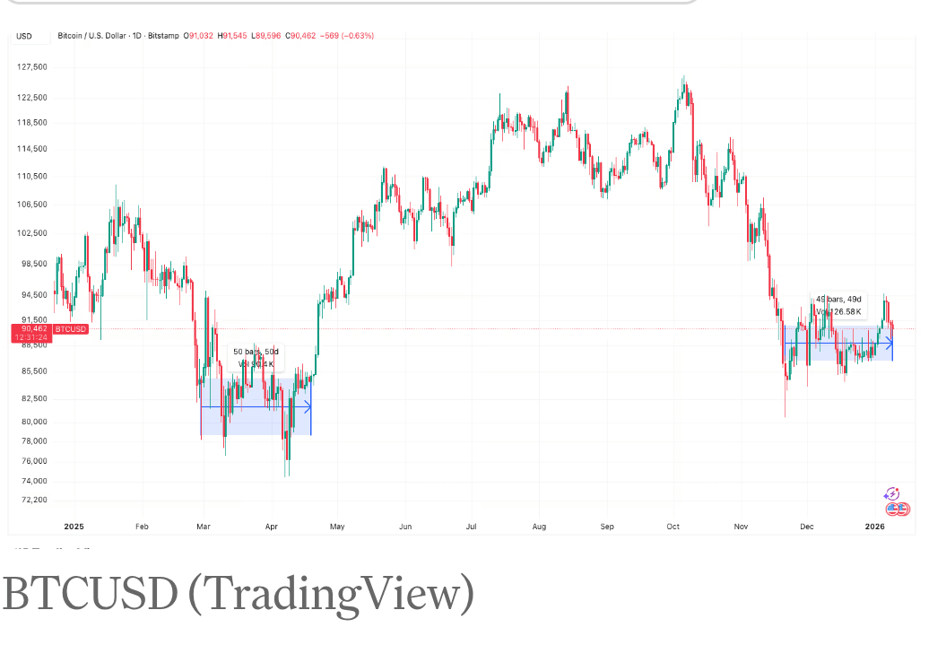 $BTC handel w okolicznościach około 90–92 tys. USD, spadek o około 28% w stosunku do rekordowego maksimum z końca 2025 roku. �
