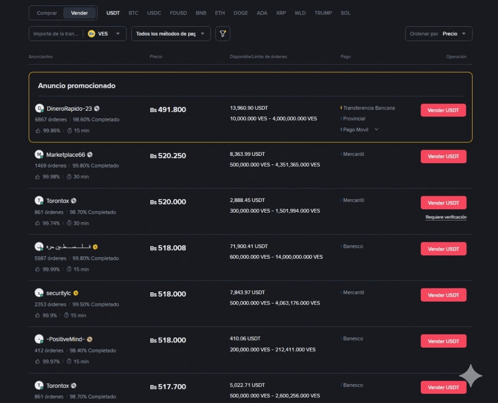 Obraz pokazuje, że cena sprzedaży ustabilizowała się w zakresie od 518 do 520 Bs za USDT w większości standardowych ogłoszeń. Oznacza to znaczący spadek w porównaniu z szczytowym poziomem 800 Bs, ale nadal jest to wartość znacznie wyższa i wrażliwa na wahania w porównaniu do poprzednich tygodni. Obecność promowanej oferty na poziomie 491,800 Bs sugeruje, że niektórzy handlowcy są gotowi sprzedawać po niższej cenie, aby szybko uzyskać płynność.