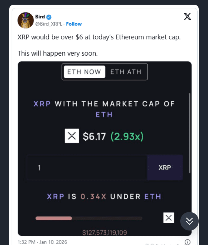 Nowy post entuzjasty kryptowalut Birda przedstawia inny sposób oceny wartości XRP – porównując ją bezpośrednio do $ETH wyłącznie na podstawie kapitalizacji rynkowej, a nie krótkoterminowych ruchów cenowych czy spekulacji.