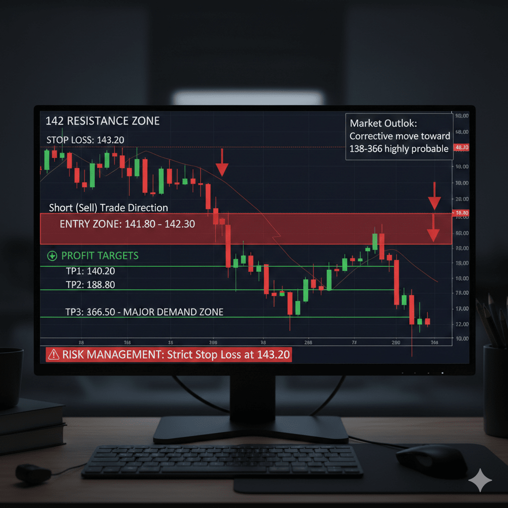 Jeśli cena nie utrzyma się powyżej 142, będzie to sygnał utraty byczego momentum. W takim scenariuszu korekcyjny ruch w stronę strefy popytu 138–136 staje się bardzo prawdopodobny. Ta strefa historycznie przyciągała kupujących i może działać jako tymczasowa podłoga.