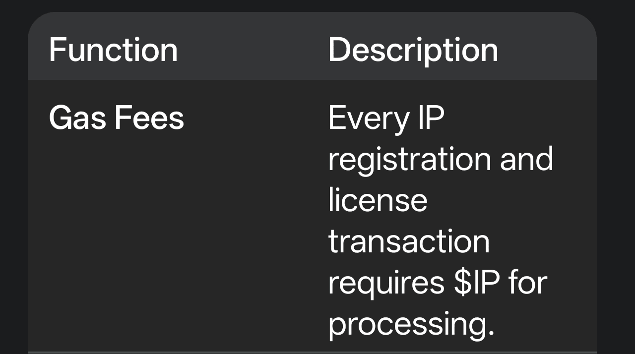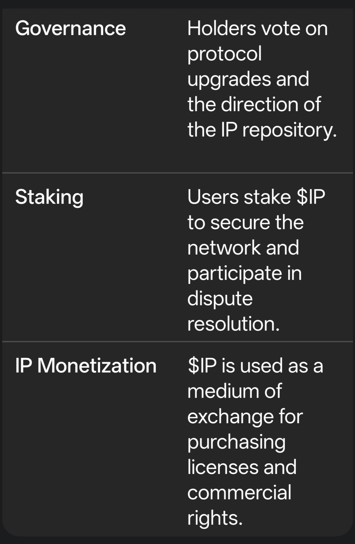 Moneta $IP jest sercem tego ekosystemu. Na styczeń 2026 roku pełni cztery podstawowe funkcje: