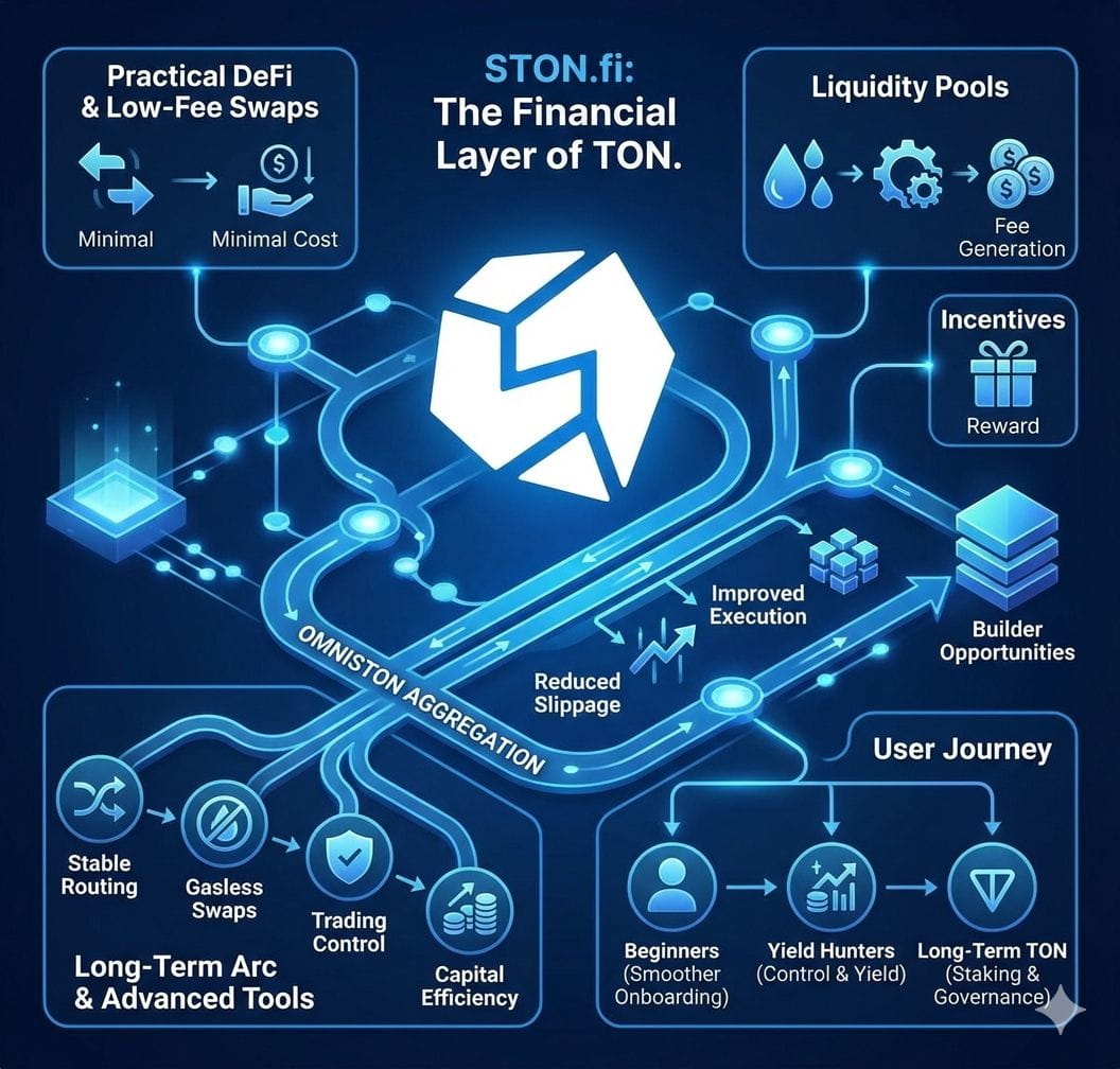 Ekosystem TON szybko przeszedł od eksperymentów do rzeczywistych, użytecznych rozwiązań DeFi — a STON.fi to ważna przyczyna tego rozwoju. To, co kiedyś wydawało się rozproszonymi wymianami i zabawkowymi produktami, teraz wygląda jak złożona warstwa finansowa: niskoprzejściowe wymiany, kompozytywna płynność oraz warstwa agregacji (Omniston), która łączy wszystko razem, dzięki czemu operacje i strategie naprawdę działają w rzeczywistym świecie. Poniżej wyjaśniam, co się dzieje, dlaczego to ważne dla różnych użytkowników (początkujących, twórców, poszukiwaczy zysków, długoterminowych posiadaczy TON) oraz jakie należy mieć na uwadze kompromisy.