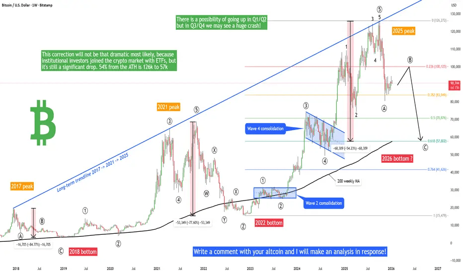 Teraz musimy przyjrzeć się teorii fal Elliotta, która z mojego punktu widzenia działa na Bitcoinie idealnie. Już mieliśmy duży spadek z 125k do 81k pod koniec 2025 roku. Wygląda na to, że możemy oznaczyć tę falę jako falę (A) lub (W). Obecnie fala (B) lub (X) jest w toku i jest to bycza fala korekcyjna, która może podnieść cenę do 100k lub 103k. W tym przypadku byłoby to idealne rozszerzenie FIB 1:1 dla korekty ABC do 57k. Zatem istnieje możliwość wzrostu w Q1/Q2, ale w Q3/Q4 możemy zobaczyć ogromny krach! Oczywiście to tylko spekulacja, musimy wziąć pod uwagę wszystkie scenariusze. Musimy zobaczyć więcej danych w nadchodzących dniach i tygodniach, aby potwierdzić ten scenariusz. Dziękuję i życzę udanych transakcji!