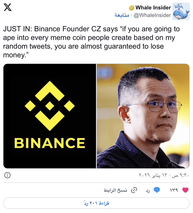 CZ ostrzega inwestorów przed zakupem kryptowalut związanych z memami na podstawie przypadkowego wpływu na mediach społecznościowych.