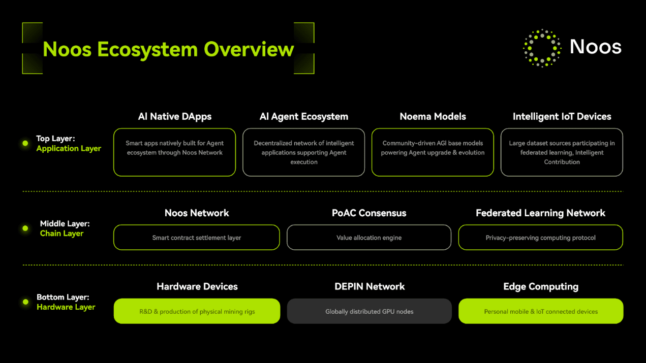 Noos przewiduje długoterminowy system ekonomiczny dla inteligencji opartej na krzemie—integrując aplikacje, protokoły i sprzęt w jedną zjednoczoną strukturę, która łączy generację danych, szkolenie modeli i dystrybucję wartości.