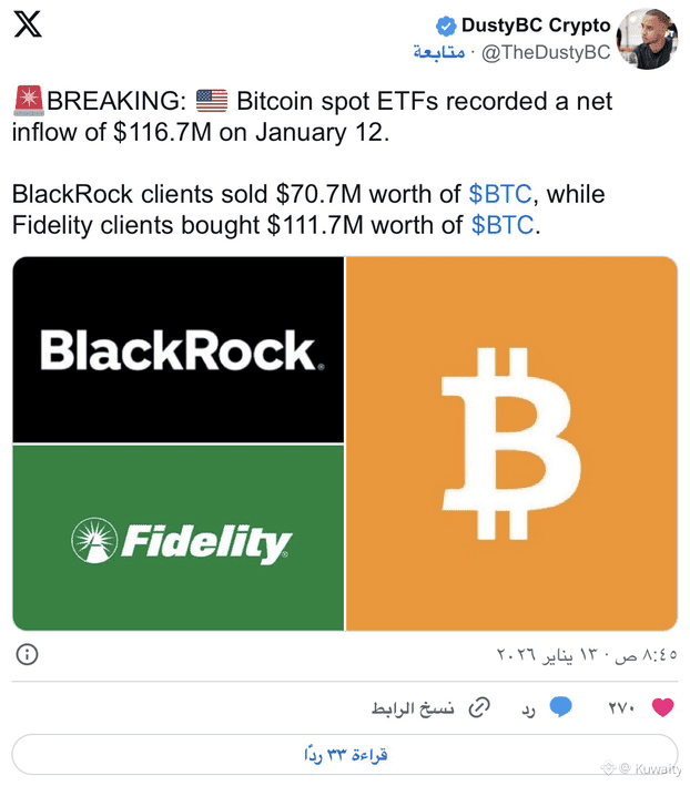 عادت صناديق $BTC الفورية المتداولة في الولايات المتحدة إلى المنطقة الإيجابية في 12 يناير، مسجلة تدفقات صافية بقيمة 116.7 مليون دولار. تظهر البيانات اهتمامًا متجددًا رغم عمليات البيع الواضحة من قبل المؤسسات الكبرى. راقب المشاركون في السوق عن كثب تحركات رأس المال التي كشفت عن تحول معقد في مواقف المستثمرين. هذه التدفقات تشير إلى الثقة، لكنها ليست بلا تردد.