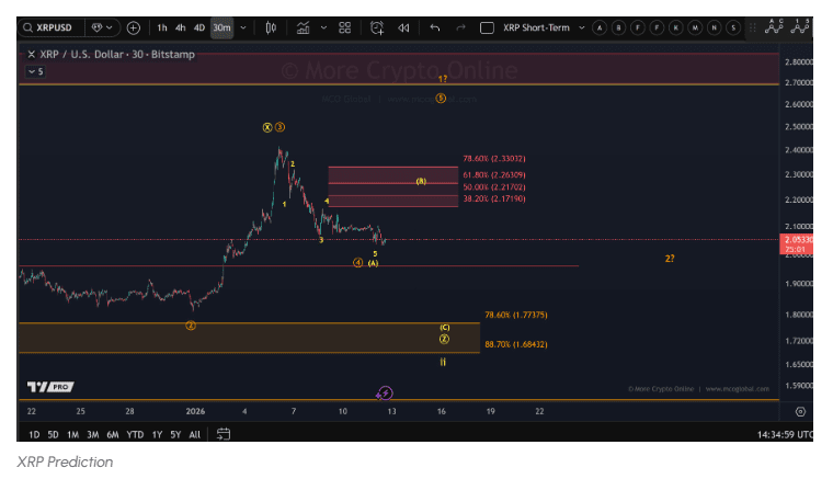 Jeśli XRP nie odzyska strefy 2,09–2,17 USD, nacisk na spadek może się ponownie pojawić, z pierwszym wsparciem na poziomie 0,618, a następnie głębszym wsparciem na poziomie korekcyjnym 0,786 w okolicach 1,91 USD. Przecięcie tego poziomu odsłoniłoby obszar niższego popytu w okolicach 1,77 USD, który stanowi podstawę szerokiego strukturalnego układu Fibonacciego.