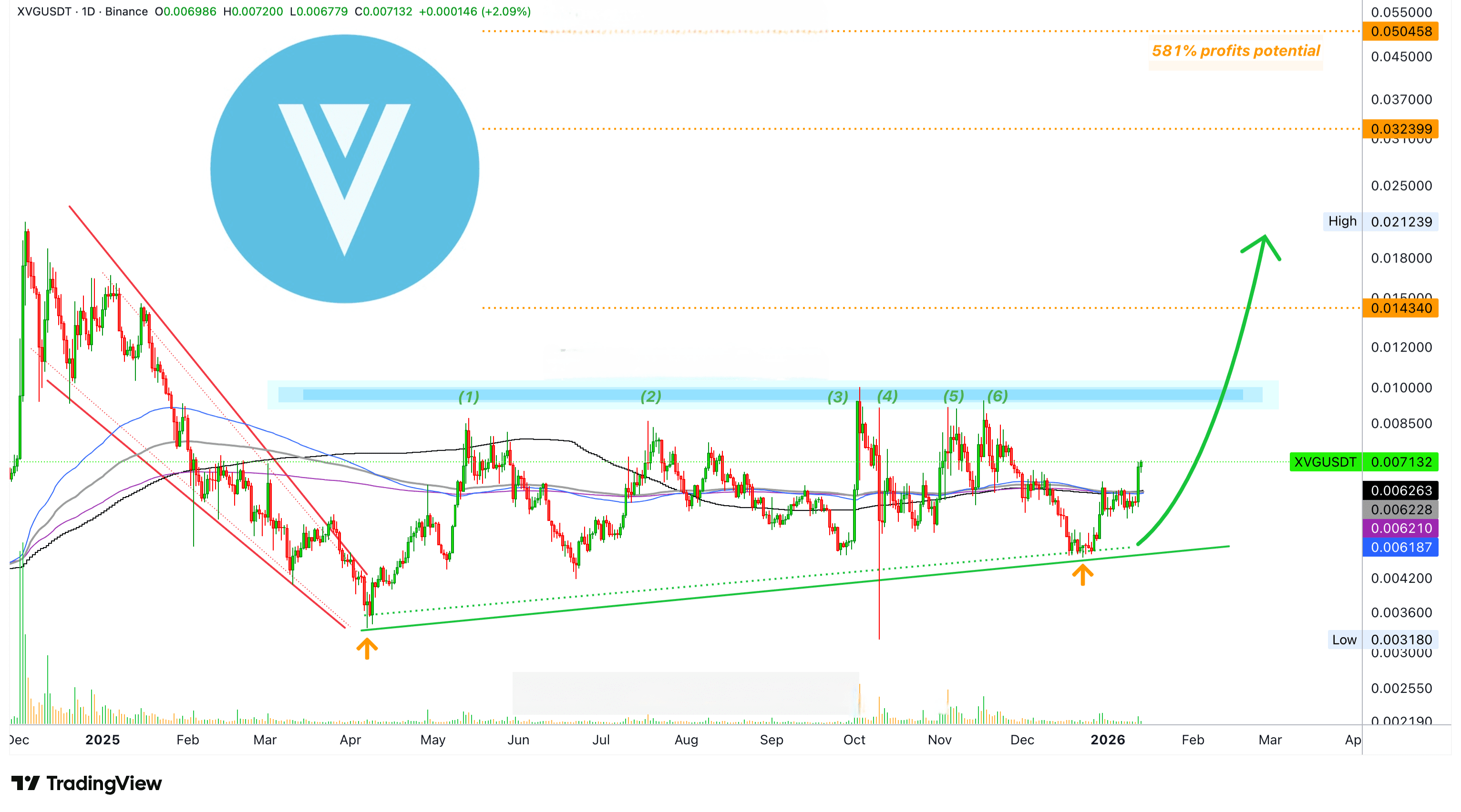 Jednym ze sposobów na sprawdzenie, kiedy wykres naprawdę i absolutnie rośnie, jest jego przekroczenie wielu średnich ruchomych. Dzieje się dokładnie to dzisiaj z XVGUSDT (Verge).
