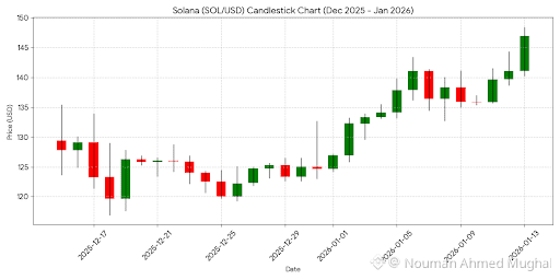 The following candlestick chart illustrates Solana's price action from mid-December 2025 through January 13, 2026, capturing the recent recovery and the attempt to break through the \$145 resistance.