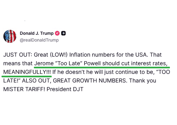 Po pojawieniu się najnowszego raportu CPI, który okazał się niższy niż oczekiwano, Donald Trump pochwalił dane inflacyjne jako „piękne (NISKIE!)” i otwarcie wezwał przewodniczącego Fedu Jeromego Powella, aby obniżył stopy procentowe TERAZ.