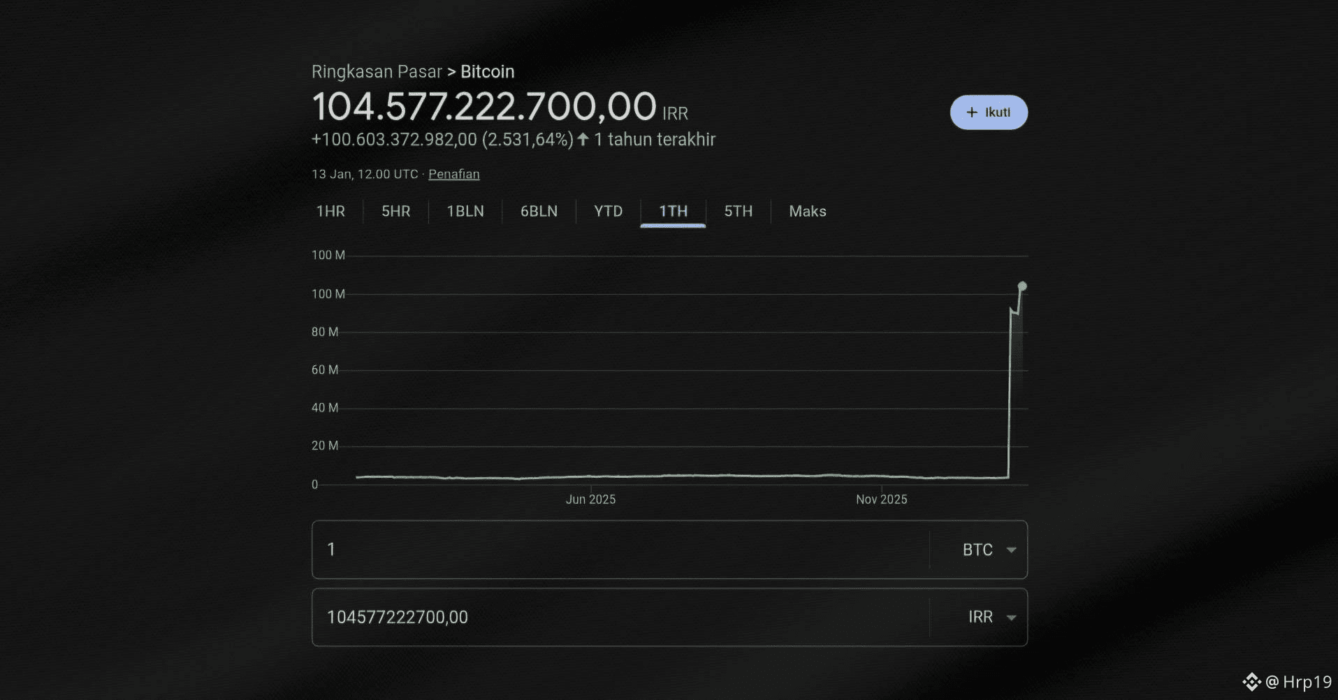 Sebagai informasi, harga Bitcoin dalam mata uang rupiah nilainya sebesar Rp1,5 miliar, sedangkan pada nilai mata uang Eropa dibanderol 78 ribu euro. Lalu, pada fiat AS harganya US$92 ribu per tokennya.