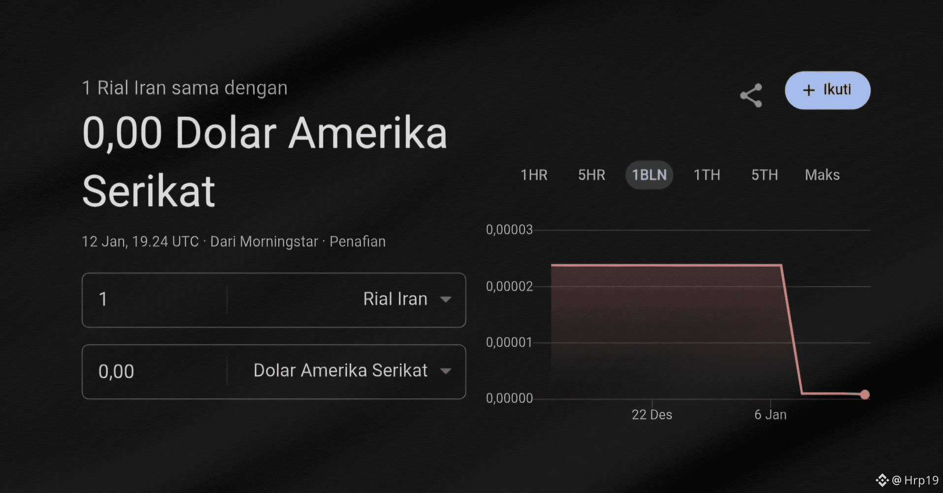 Nilai tukar mata uang Iran terhadap dolar Amerika Serikat (AS) kini tidak berharga yang dibanderol US$0. Hal ini membuat harga Bitcoin (BTC) melejit yang membutuhkan 104 miliar rial untuk mendapat 1 BTC.