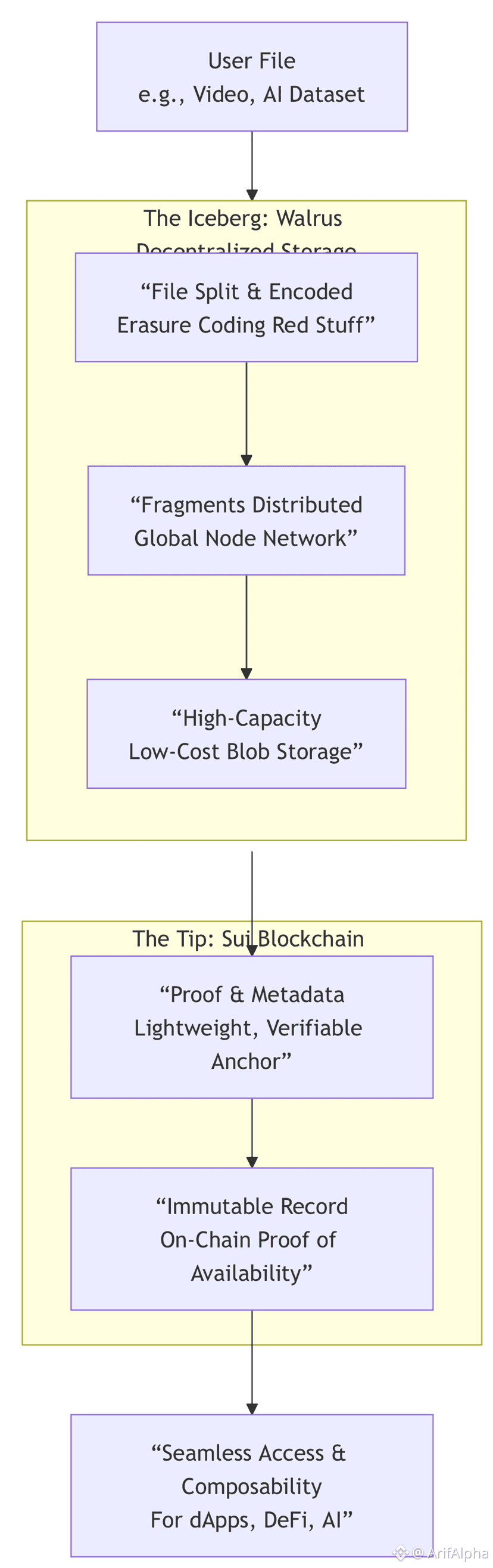 This separation of concerns is revolutionary. The heavyweight storage happens efficiently in the decentralized Walrus layer (the iceberg's bulk), while only a tiny, verifiable proof is anchored on the supremely secure Sui blockchain (the visible tip). This is how Walrus achieves costs potentially 100x lower than older decentralized storage models, without sacrificing security or verifiability.