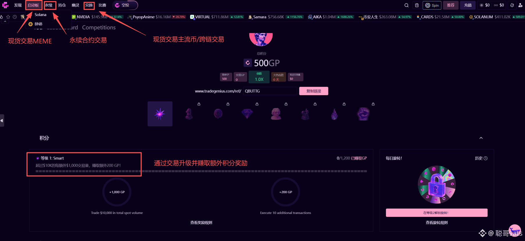Genius 已经上线了积分系统,主要通过交易、邀请、完成任务等来赚取积分。